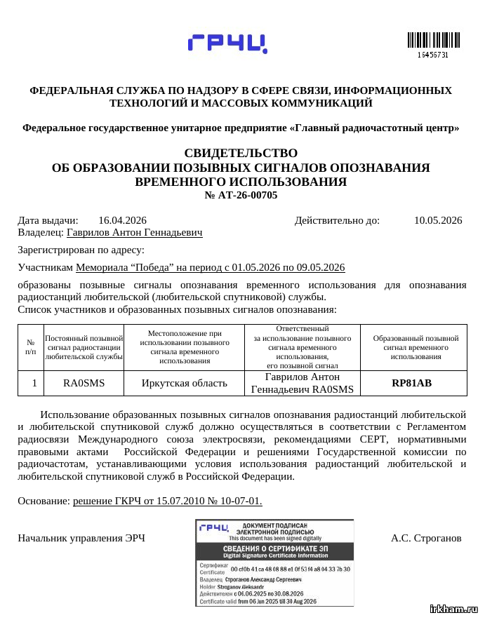 17 января 2026 г. состоялось отчётное общее собрание РО СРР по Иркутской области. По состоянию на 1 МАРТА 2026 года, своё членство в СРР продлили: R0RA R0RD R0RE R0RH R0RI R0SA R0SAAB R0SAK R0SAU R0SBI R0SBY R0SBZ R0SCB R0SCG R0SCO R0SCV R0SCW R0SCZ R0SDC R0SDF R0SDK R0SDL R0SDN R0SDO R0SDV R0SEA R0SEB R0SED R0SI R0SV R0TR R0TV Всего - 120 человек |